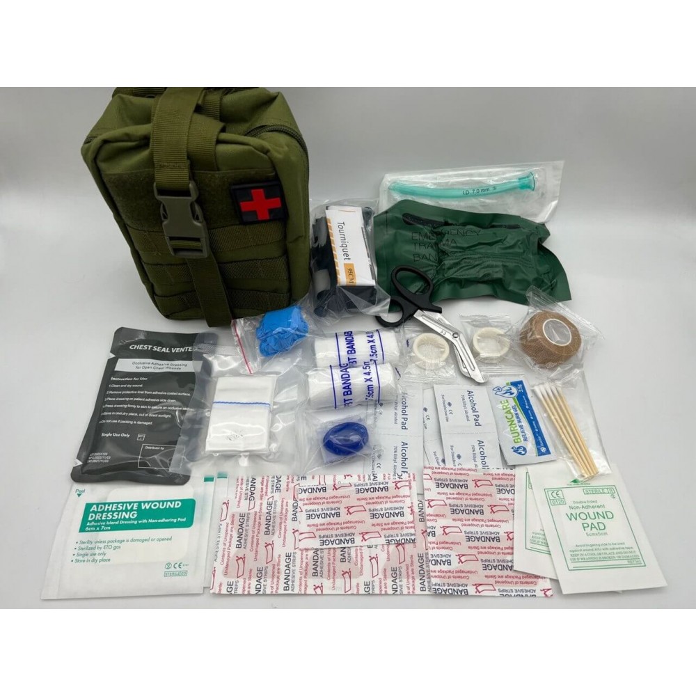 Упаковочный лист этой армейской аптечки включает в себя широкий набор необходимых медицинских инструментов и материалов. Среди них: