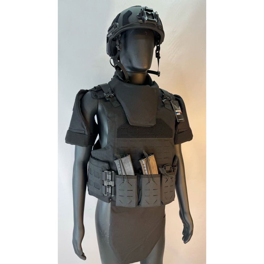 Этот бронежилет комплектуется съемными модулями защиты, которые обеспечивают защиту шеи, плеч и паховой зоны. Все модули обладают мягкой баллистической защитой. Камербанд жилета обеспечивает идеальную посадку благодаря регулировке при помощи липучки Velcro и эластичной шнуровки.
